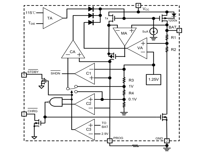 壓固定于 4.2V。充電電流可通過 PROG 腳外接一